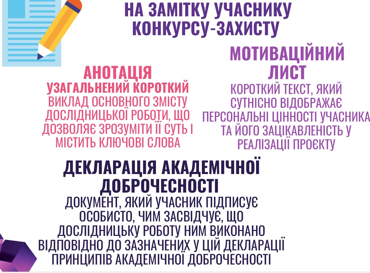 На допомогу учаснику конкурсу-захисту Правила оформлення списку джерел Декларація доброчесності Вимоги до робіт Вимоги до оформлення постера Вимоги до мотиваційного листа