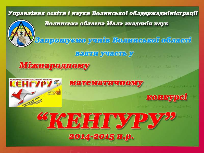 Відповідно до Положення про Міжнародний математичний конкурс «Кенгуру», затвердженого наказом Міністерства освіти і науки України від 07.05.2012 № 552, зареєстрованого у Міністерстві юстиції України 24 травня 2012 р. за № 819/21131, листа Міністерства освіти і науки України від 11.09.2014 № 1/9-458 «Про проведення Міжнародного математичного конкурсу «Кенгуру» у 2014/2015 навчальному році» Міжнародний математичний конкурс «Кенгуру» в Україні буде проведено у два етап