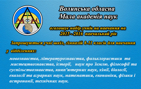 Волинська обласна Мала академія наук оголошує набір слухачів на 2015-2016 навчальний рік. Запрошуються учні шкіл, гімназій 8-11 класів для навчання у таких відділеннях: мовознавства, літературознавства, фольклористики та мистецтвознавства, історії, наук про Землю, філософії та суспільствознавства, комп’ютерних наук, хімії, біології, екології та аграрних наук, математики, економіки, фізики і астрономії, технічних наук.