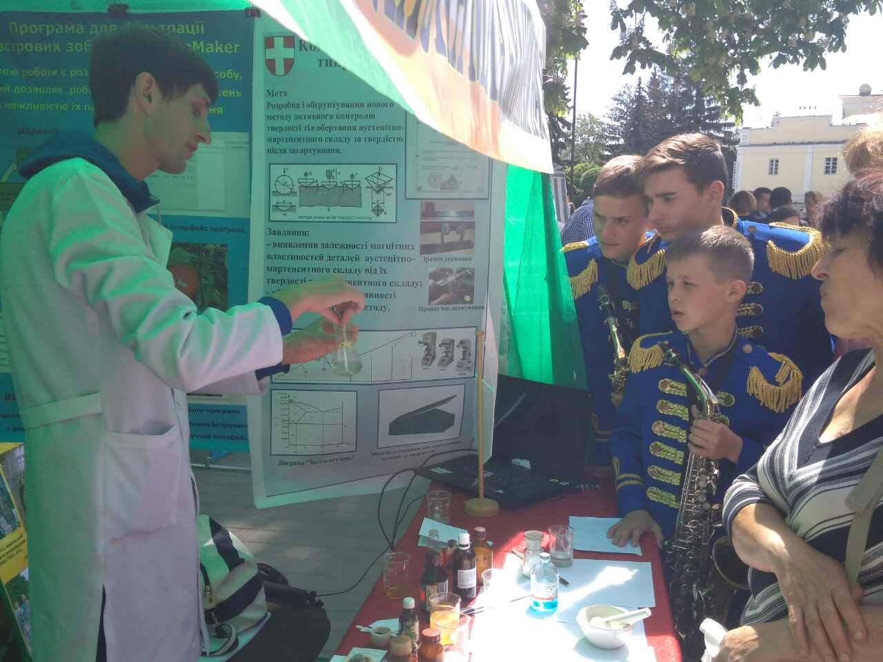 На питання «Чи може хімія бути цікавою для школяра?» охоче відповідав керівник секції хімії Волинської обласної МАН Ігор Пахолюк. Виявляється, знаючи склад деяких хімічних речовин, легко можна забарвити квіти білого кольору у жовтий. Тут же юні відвідувачі спостерігали за цим експериментом. Не залишили байдужими й досліди із шумовим ефектом.