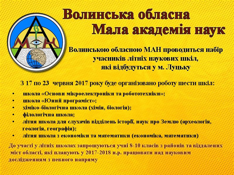 Волинською обласною МАН проводиться набір учасників літніх наукових шкіл, які відбудуться у м. Луцьку.