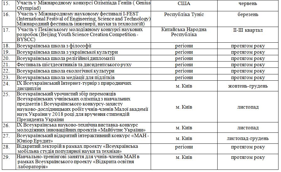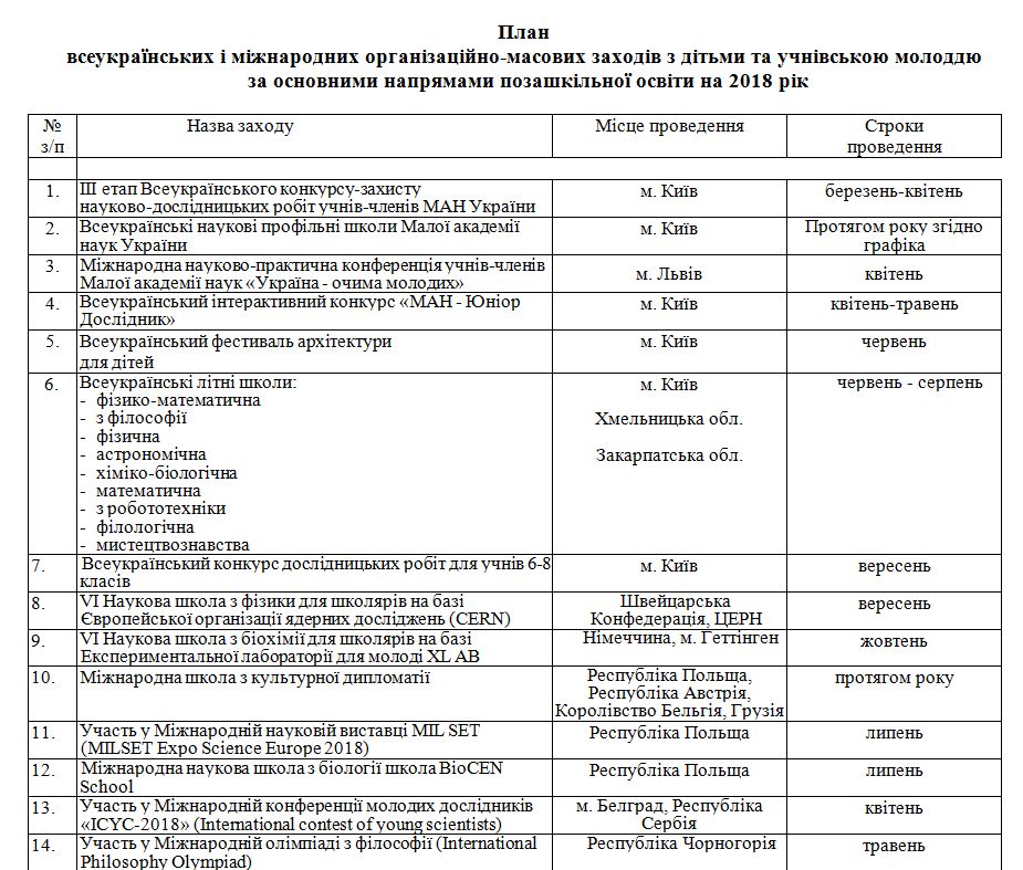 | План всеукраїнських і міжнародних організаційно-масових заходів з дітьми та учнівською молоддю за основними напрямами позашкільної освіти на 2018 рік |