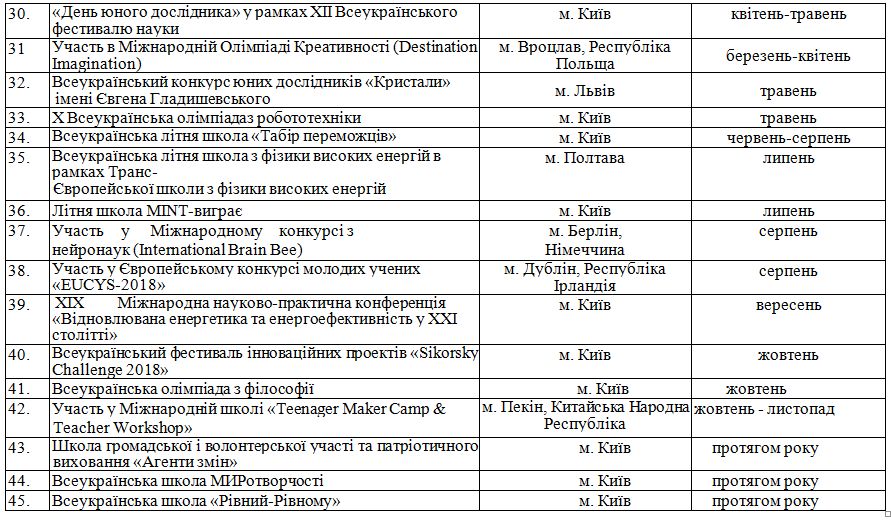 Конкурси, олімпіади, експедиції, виставки, літні школи, фестивалі, освітні лабораторії та хаби, бізнес-інкубатори та багато інших цікавих, розвиваючих, інтелектуальних заходів та проектів.