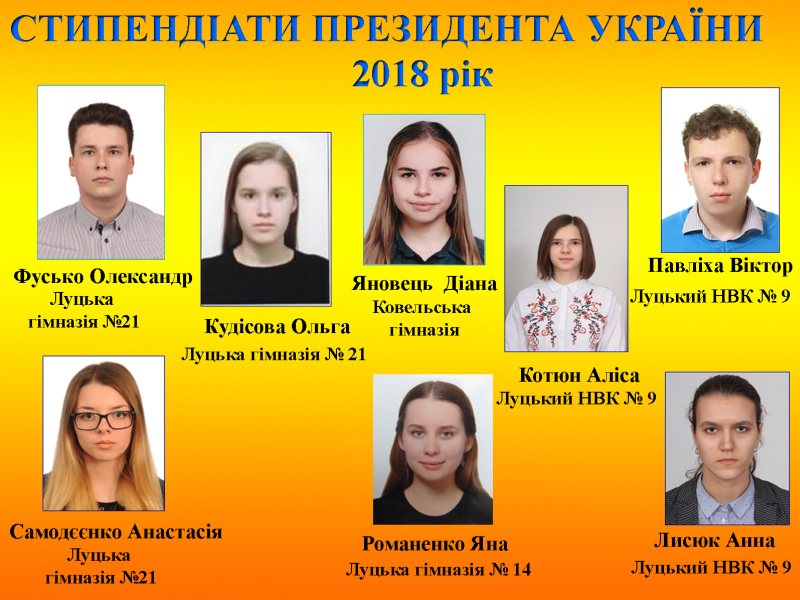6 листопада 2018 року, наказом МОН України № 1209, призначено стипендії Президента України переможцям IV етапу Всеукраїнських учнівських олімпіад з навчальних предметів і ІІІ етапу Всеукраїнського конкурсу-захисту науково-дослідницьких робіт учнів-членів Малої академії наук України 2017/2018 навчального року.