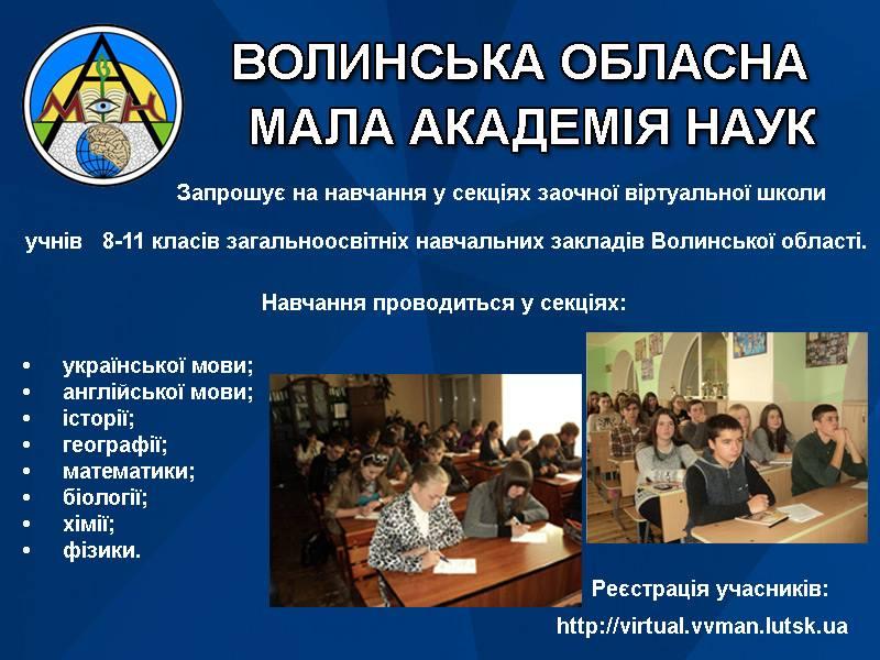 На виконання Указу Президента України № 927/2010 «Про заходи щодо розвитку системи виявлення та підтримки обдарованих і талановитих дітей та молоді», з метою залучення учнів області до науково-дослідницької роботи і покращення якості дослідницьких проектів учнів з районів, об’єднаних територіальних громад та віддалених міст області в рамках заочної віртуальної школи Волинської обласної Малої академії наук у 2018-2019 навчальному році будуть працювати секції української мови, англійської мови, історії, географії, математики, біології, хімії, фізики.