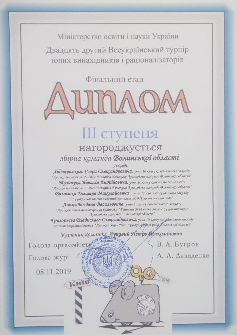 З 3 по 8 листопада 2019 року у місті Києві відбувся ХХІІ Всеукраїнський турнір юних винахідників і раціоналізаторів. Учасниками турніру стали 13 команд. Волинську область представляла збірна команда. Турнірна боротьба виявилась нелегкою та тривалою. За підсумками напруженої півфінальної гри команда Волинської області посіла ІІІ місце.