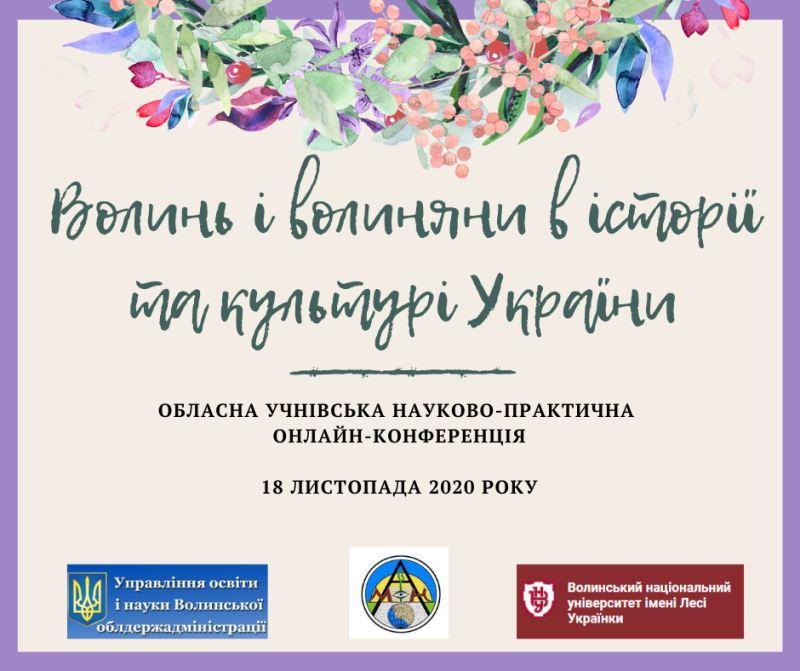 18 листопада 2020 року комунальною установою «Волинська обласна Мала академія наук» буде проведено обласну учнівську науково-практичну конференцію «Волинь і волиняни в історії та культурі України».