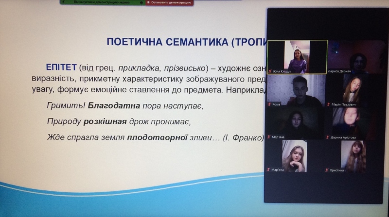 Декілька занять у форматі онлайн сконцентрували актуальну для школярів інформацію, яка стосується історії правопису української мови, передумов для змін у ньому як закономірного явища, вивчення акцентуаційних норм. Також слухачі намагались знайти орієнтири аналізу художнього твору, розкрити секрети його образності, що даватиме можливість сприйняти текст як цілісність: враховуючи епоху, біографічні відомості, стильову манеру.