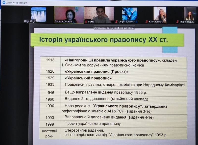 20-22 листопада 2020 року відбулась сесія для учасників секції української мови та літератури  заочно-дистанційної школи.   Модерувала захід Деркач Лариса Миколаївна, кандидат філологічних наук, доцент кафедри української мови Волинського національного університету імені Лесі Українки.