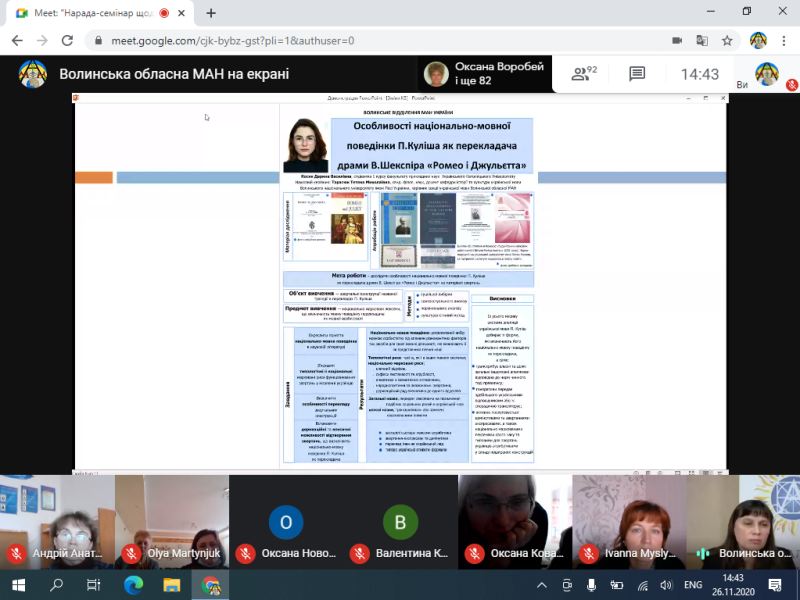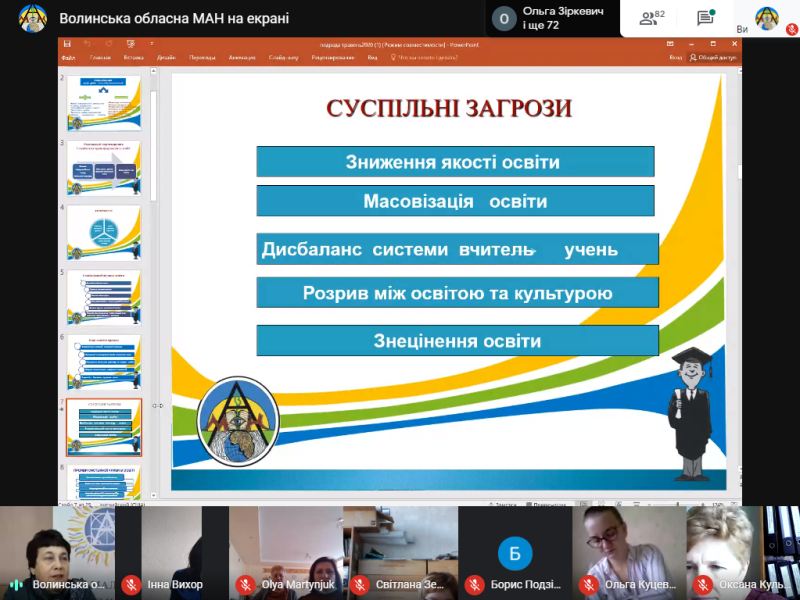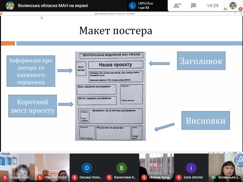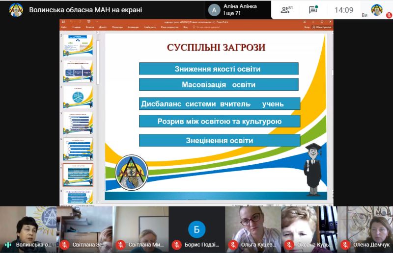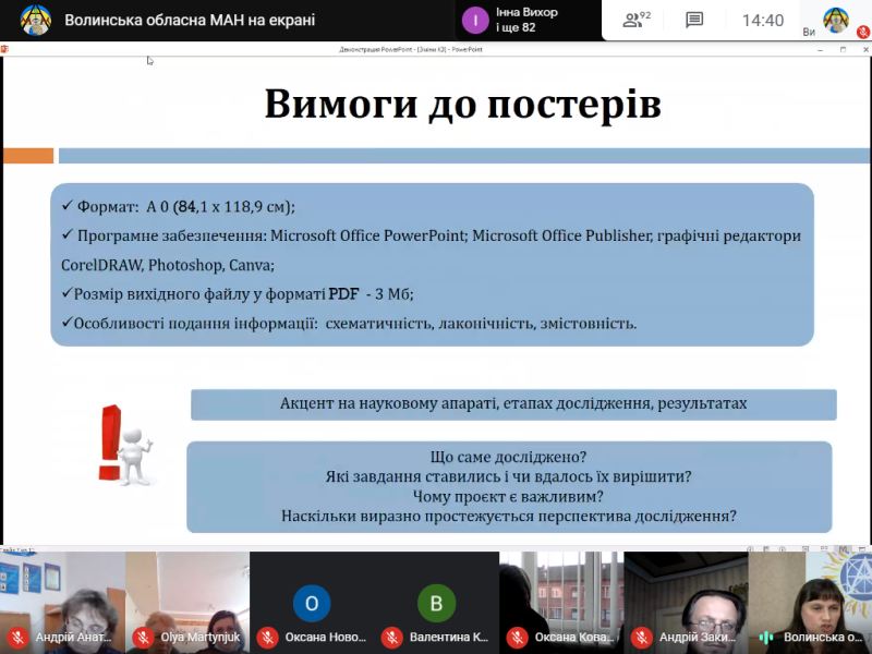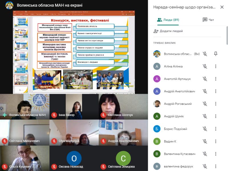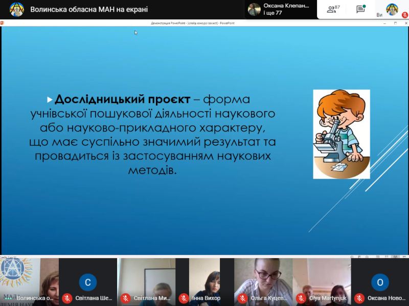 До учасників семінару з вітальним словом звернулися – Тетяна Соломіна, заступник начальника управління освіти і науки Волинської облдержадміністрації, Олег Дикий, кандидат педагогічних наук, директор Науково-навчального інституту Волинського національного університету імені Лесі Українки. Семінар продовжив виступ Галини Толстіхіної, заступника директора ВОМАН, яка у своїй доповіді детально проаналізувала релевантність сучасного освітнього простору. Тетяна Михалюк, директор Волинської обласної МАН, зосередила увагу присутніх на змінах формату проведення Всеукраїнського конкурсу-захисту науково-дослідницьких робіт учнів-членів МАН України. З практичними порадами щодо підготовки до постерного захисту та наукової конференції виступила Ольга Кулібаба, методист відділень мовознавства, літературознавства, фольклористики та мистецтвознавства Волинської обласної МАН. У чаті семінару керівники гуртків ставили запитання, на які отримали компетентні коментарі.