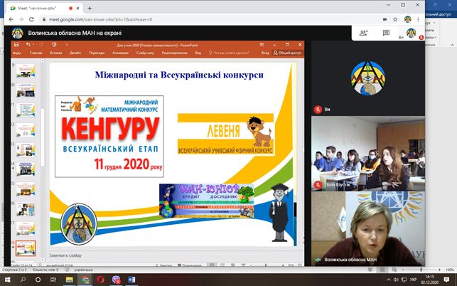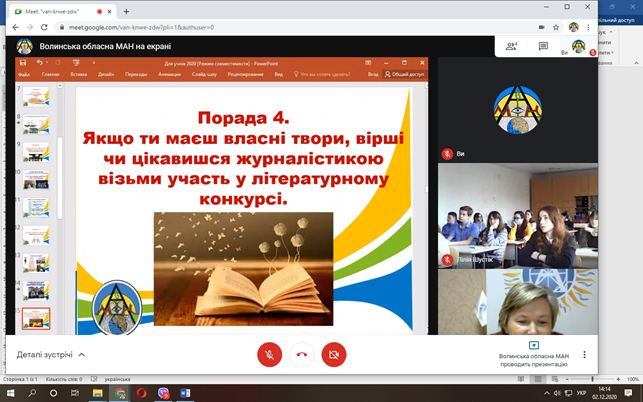 2 грудня 2020 року відбулася онлайн-зустріч з учнями Нововолинського наукового ліцею-інтернату, на якій розглянули питання сучасних трендів та змін в освіті. Ліцеїсти отримали корисні поради як прокачати свої навички за допомогою участі у різноманітних проєктах Малої академії наук України.