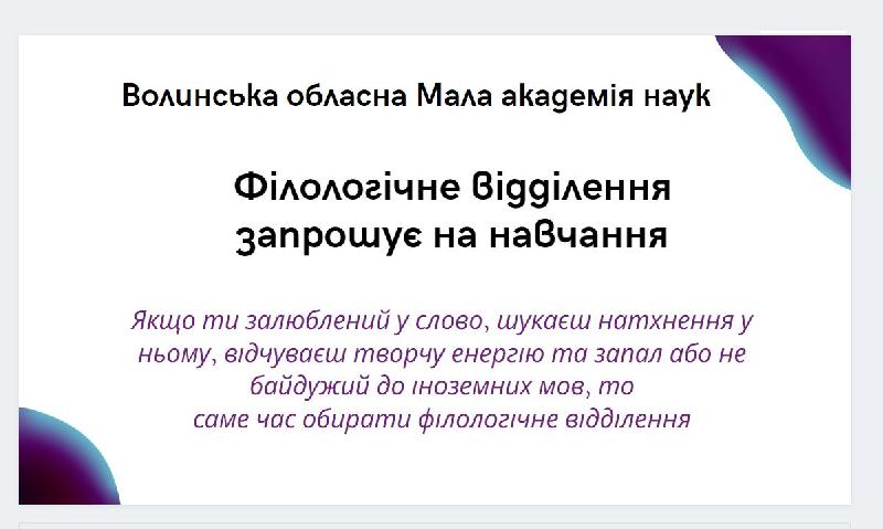 Юний друже, сучасний світ пропонує безліч шляхів для самореалізації. Мала академія наук – один із них. Якщо ти залюблений у слово, шукаєш натхнення у ньому, відчуваєш творчу енергію та запал або не байдужий до іноземних мов, то саме час обирати філологічне відділення.