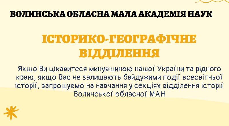 Юні друзі, якщо Ви цікавитеся минувшиною нашої України та рідного краю, якщо Вас не залишають байдужими події всесвітньої історії, запрошуємо на навчання у секціях відділення історії Волинської обласної МАН. Тут під керівництвом кваліфікованих науковців Ви матимете змогу поглибити свої знання з історії, ознайомитися з азами дослідницько-пошукової роботи, освоїти навички роботи з історичними джерелами.
