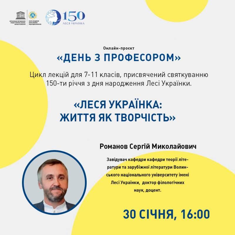 В рамках проєкту "День з професором" відбудеться цикл лекцій для 7-11 класів, присвячений святкуванню 150-річчя з дня народження Лесі Українки