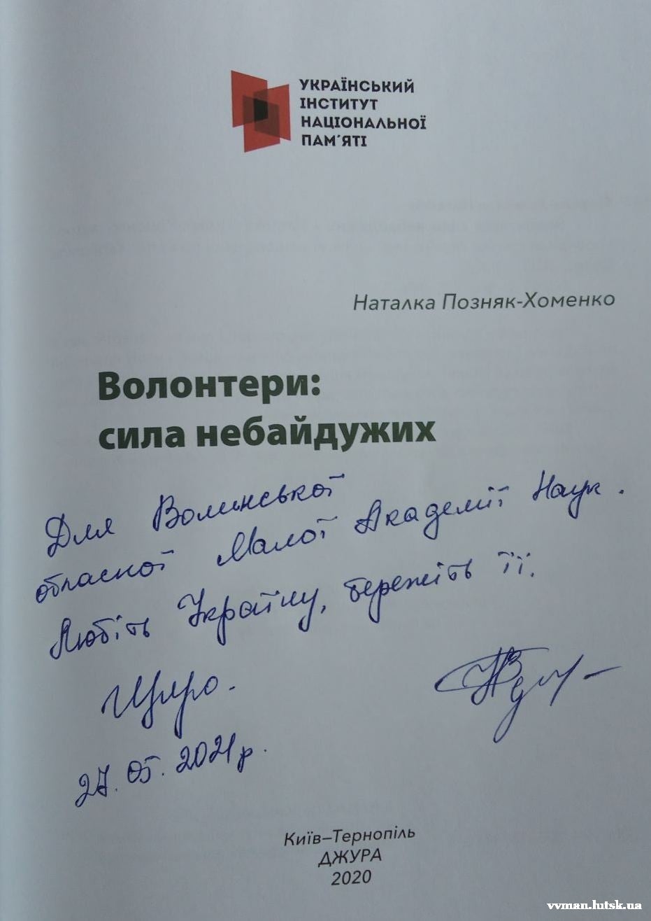Авторка Наталія Позняк-Хоменко подарувала свою книгу «Волонтери: сила небайдужих» Малій академії наук, адже у виданні опубліковані спогади й волинських волонтерів. Описані волонтерські історії дають уявлення про масштаби такого явища, як волонтерський рух, який у 2014-2015 роках став одним із важливих чинників спротиву російській агресії.