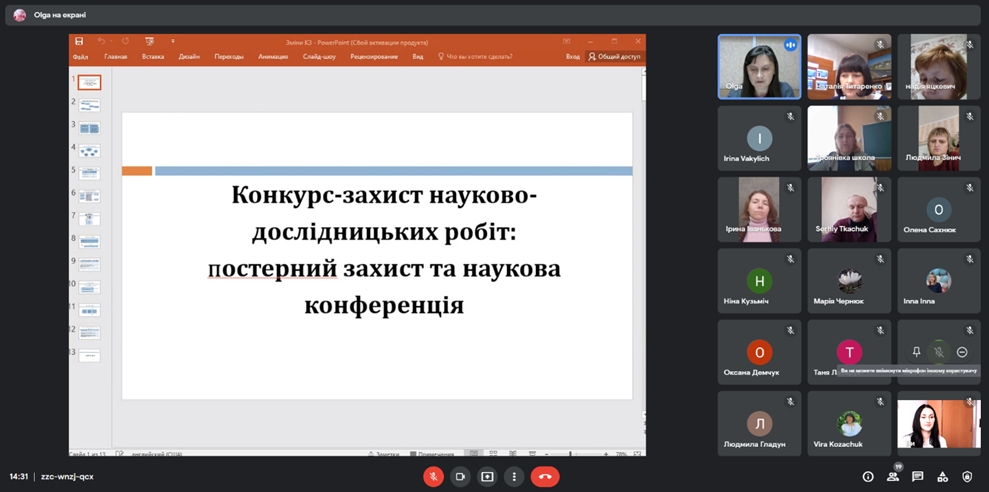 У семінарі взяла участь методист Волинської обласної МАН Ольга Кулібаба, яка звернула увагу на особливостях проведення конкурсу онлайн, деталізувала методичні аспекти підготовки учнів до постерного захисту та виступу на науковій конференції. Актуалізувались питання щодо структури доповідей, розмежування виступів відповідно до формату, оформлення постера та презентації.