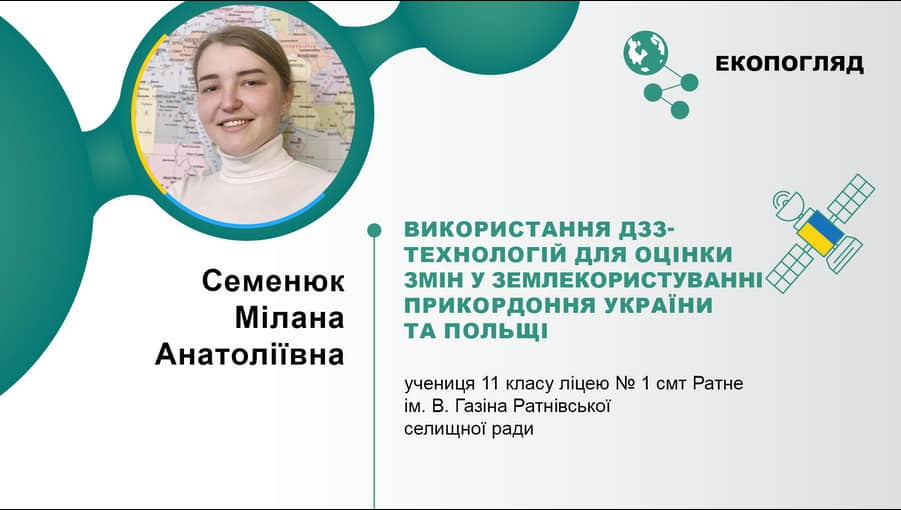 - Мілана Семенюк, учениця Ратнівського ліцею №1 імені В.Газіна, слухачка заочно-дистанційної школи Волинської МАН. ЇЇ робота із застосування різних супутникових та ГІС-ресурсів для моніторингу землекористування у нашому регіоні оцінена найвище серед фіналістів.