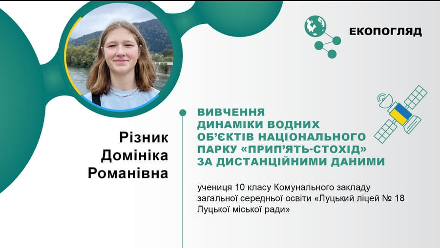 - Домініка Різник, учениця Луцького ліцею #18, слухачка секції ГІЗ, яка працює на базі Луцького національного технічного університету. Домініка здійснила значний обсяг роботи із опрацювання старих топографічних карт та сучасних супутникових знімків, завдяки чому оцінено динаміку водності водойм національного природного парку "Прип'ять-Стохід" та отримала бронзову нагороду конкурсу.