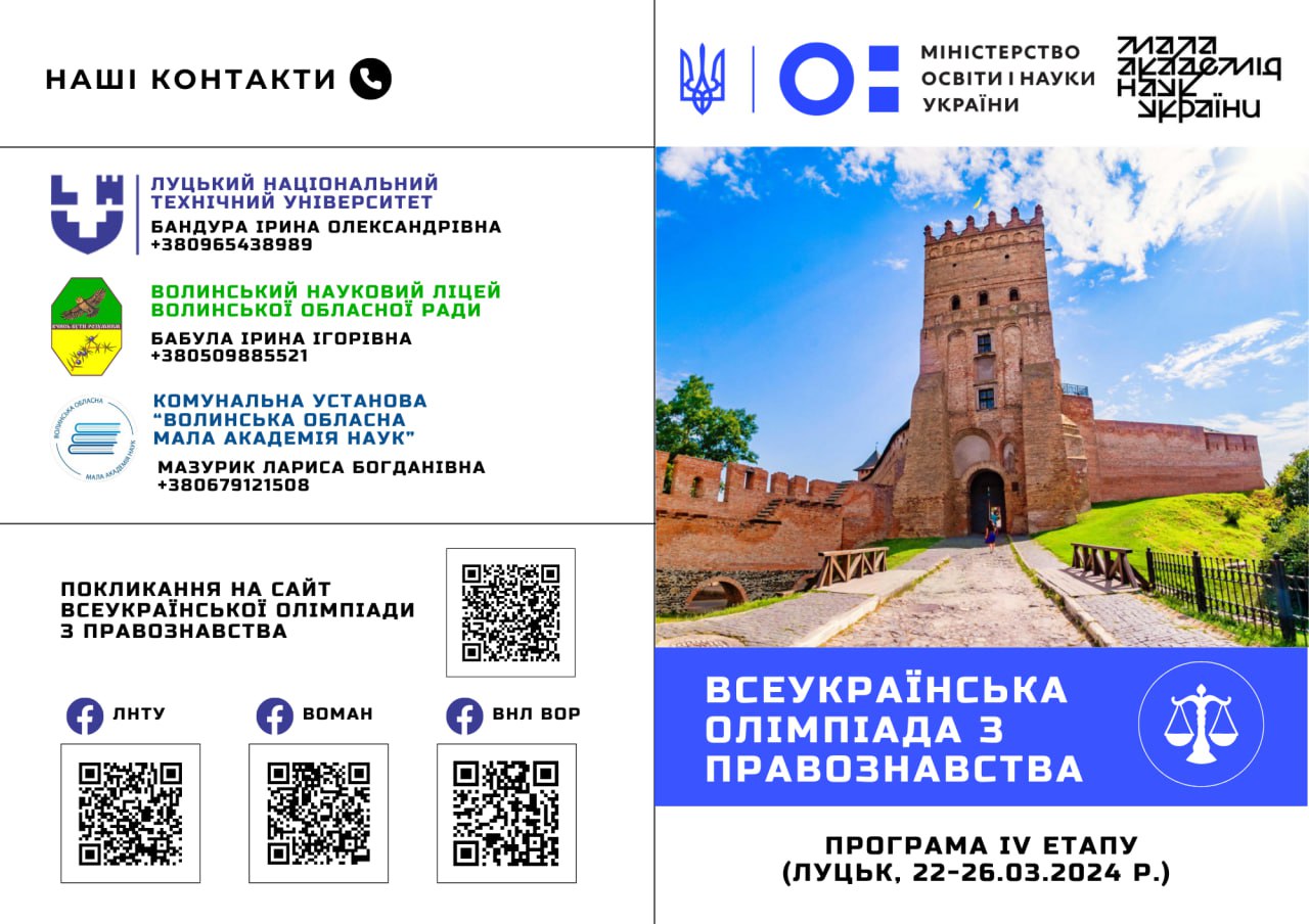 IV етап ХІХ Всеукраїнської учнівської олімпіади з правознавства буде проведено в м.Луцьку з 22 по 26 березня 2024 року.