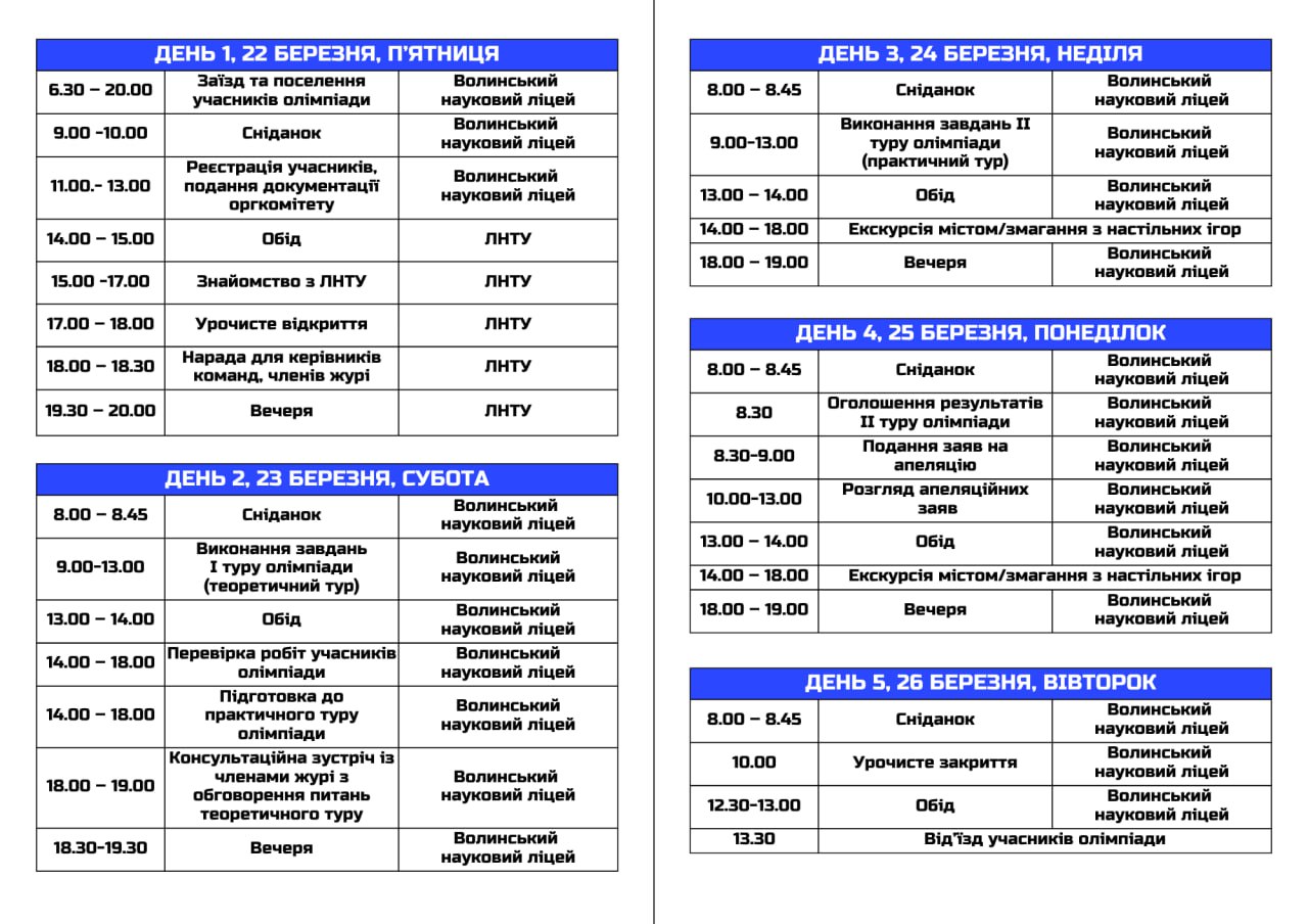Відкриття олімпіади: 22.03.2024 року о 17.00 год. за адресою: м.Луцьк, вул. Львівська, 75, головний корпус Луцького національного технічного університету.
