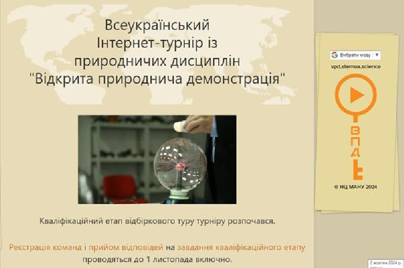 Повідомляємо, що у жовтні-грудні 2024 року буде проведено ХV Всеукраїнський Інтернет-турнір із природничих дисциплін
