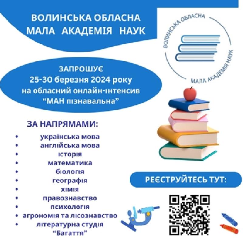 Волинська обласна Мала академія наук запрошує учнів 8-11 класів до участі в обласному інтенсиві “МАН пізнавальна”, який відбудеться з 25 по 30 березня 2024 року.
